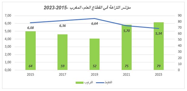 • مؤشر النزاهة في القطاع العام هو مؤشر مركب يتكون من ستة أبعاد: استقلال القضاء والفعالية الإدارية والانفتاح التجاري وشفافية الميزانية والمواطنة الإلكترونية وحرية الصحافة.