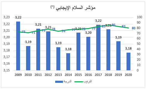 (*) تتوافق درجة المؤشر المنخفضة مع مستوى عالٍ من السلام الإيجابي.