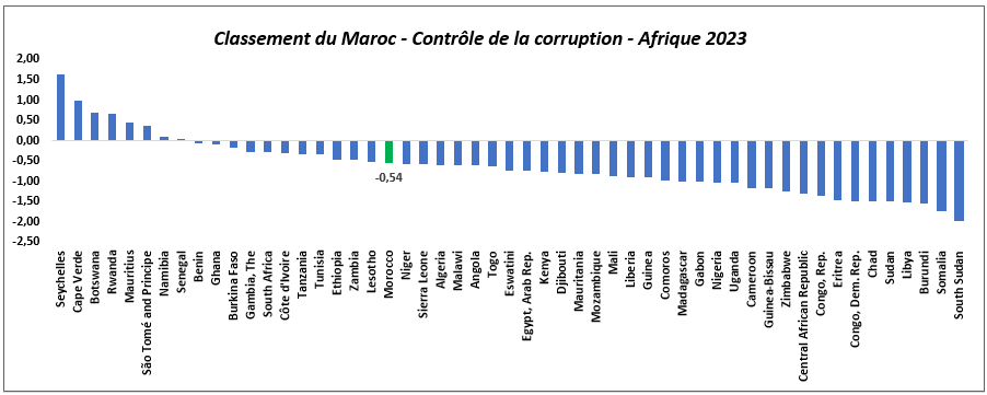 • Sur la région MENA et par rapport à l’indicateur « contrôle de la corruption », le Maroc se classe dans la 11ème position. Par ailleurs, sur le continent africain il occupe la 20ème position.