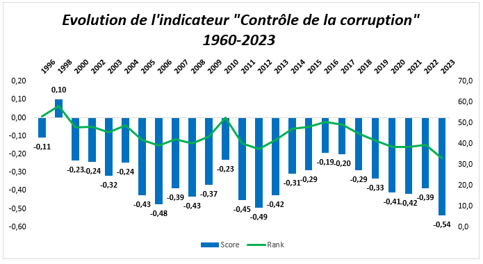• L'indicateur "Contrôle de la corruption" a connu une baisse préoccupante de 0,15 point dans son score et de 6,6 points dans le classement par rapport à 2022, soulignant un affaiblissement de la performance dans ce domaine ;