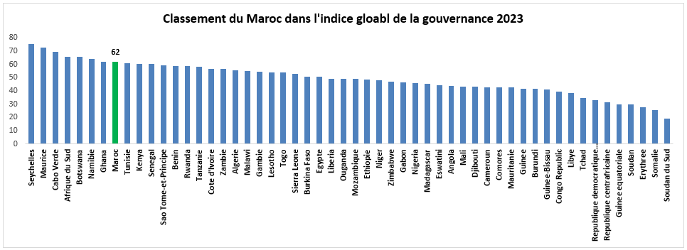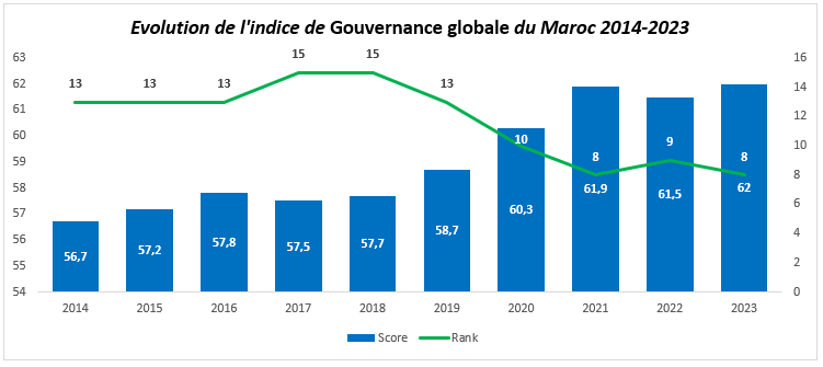 Le Maroc a gagné 0,5 point, passant de 61,5 en 2022 à 62,0 en 2023, et se positionne désormais au 8ième rang sur 54 pays africains. Globalement, entre 2014 et 2023, le Maroc a progressé de 5,3 points sur l'indice de gouvernance globale, marquant une amélioration notable de son classement, passant de la 13ième à la 8ième place ;